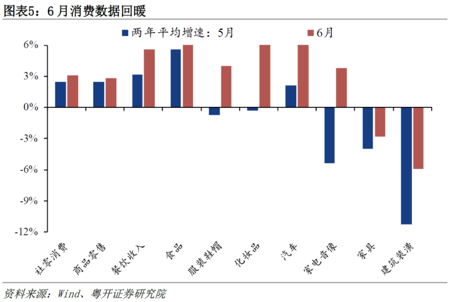 从月度节奏看,4-5月经济明显走弱,6月经济动能趋稳。疫后居民消费回暖和政策支持下的基建投资成为托底经济的重要动力。6月社零消费两年平均同比为3.1%,高于4-5月的2.6%和2.5%,其中餐饮收入两年平均增速5.6%,仅次于2月。6月工业增加值的两年平均增速从5月的2.1%升至4.1%,服务业生产指数从3.0%升至4.0%,广义基建投资从9.1%升至10.0%。