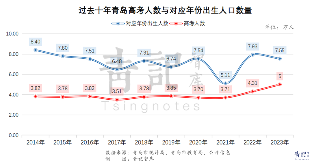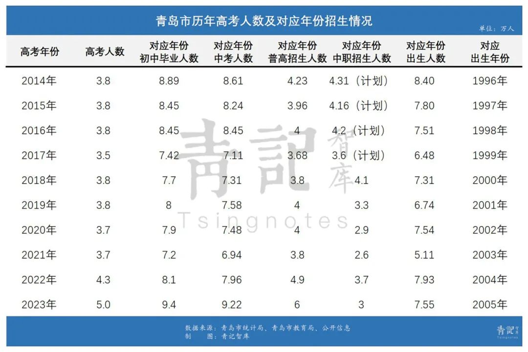 先来看一组数据:2019年青岛市普通高中招生4.9万人,比上年增长1.1万人;2020年青岛市普通高中招生6万人,比上年增长1.1万人;2022年的高考生恰是2019年入学,按照18岁参加高考来算,也就是2004年出生。而从2004年开始,青岛恰好进入出生人口数量“小高峰”。