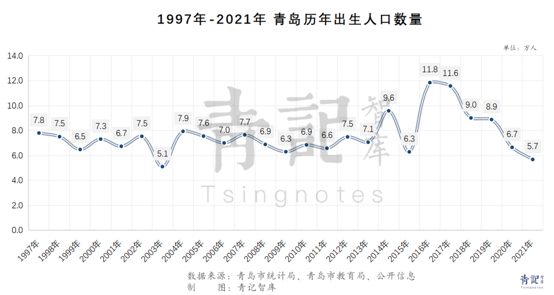 新生儿数量是教育生源的基础。然而,青岛的出生人口自2016年(11.84万)达到短暂高峰后,急转直下,2021年出生人口仅为5.68万,6年间减少了6.16万人。