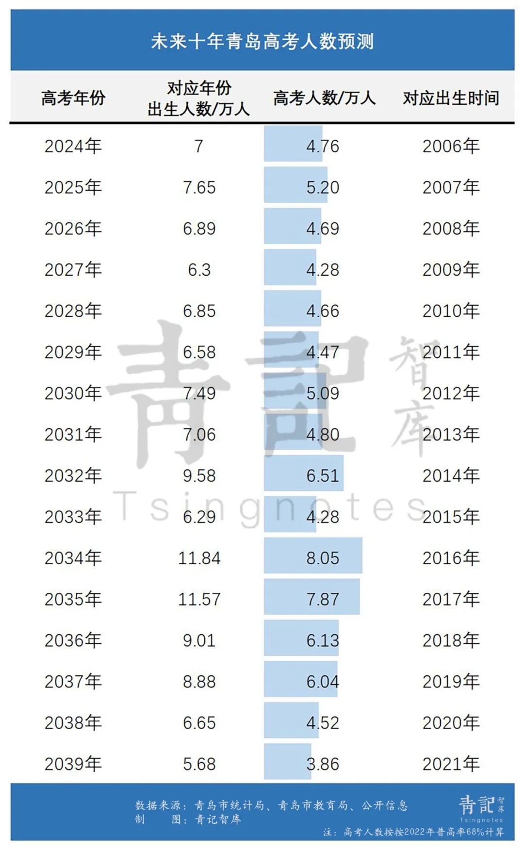 综合出生人口的变化,综合青岛的普高率(2022年为68%)来看,未来十年,青岛高考报名人数还将持续增长,基本维持在4.5万人以上的规模。