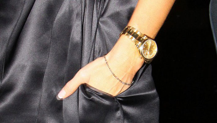 安妮斯顿对劳力士的重视度非常高,这块金劳经常出现在她的不同街拍中,她用金劳搭配黑色肩带休闲造型,或者露肩装,可以露出她迷人的锁骨和脖颈线条,中性优雅充满活力。