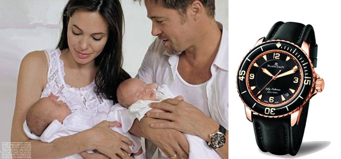 朱莉也曾在怀着双胞胎的时候,以腹中婴儿的名义,作为父亲节礼物为皮特购买了宝珀五十噚,市场价21.8万人民币,皮特曾在很多场合都戴过这块腕表。