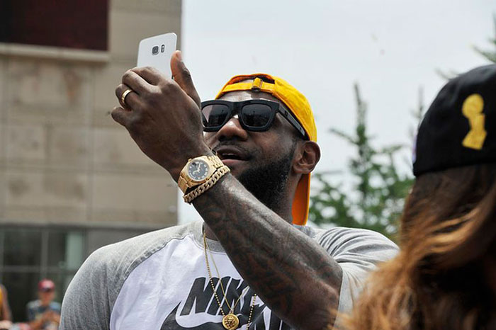 爱彼代言人NBA球星勒布朗-詹姆斯被拍到接受花车巡游时佩戴了一块劳力士已经停产的41mm Day-Date II,爱彼曾为他设计了一款特别版的皇家橡树离岸型,不过詹姆斯还是忍不住在庆祝的时候戴上自己的爱表。