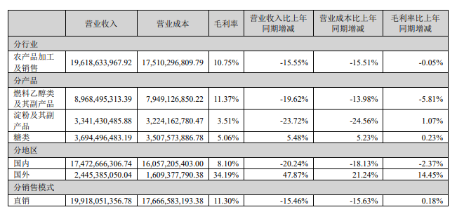 公司年报显示,燃料乙醇类及其副产品的营收、毛利在分产品中占比最大,是公司传统优势业务。作为核心产品,燃料乙醇在报告期内的营收为89.68亿元,同比下降19.62%;毛利率同比下降5.81%。
