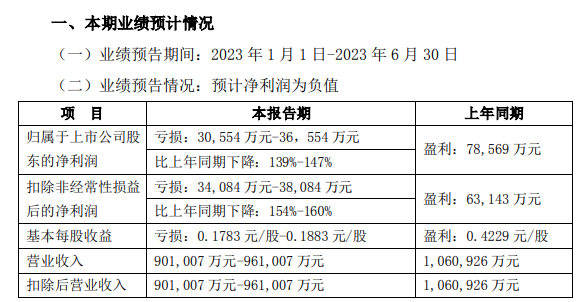 7月15日,中粮科技发布2023年半年度业绩预告,预计上半年归属于上市公司股东净亏损3.06亿元至3.66亿元,同比下降139%-147%,由盈转亏。