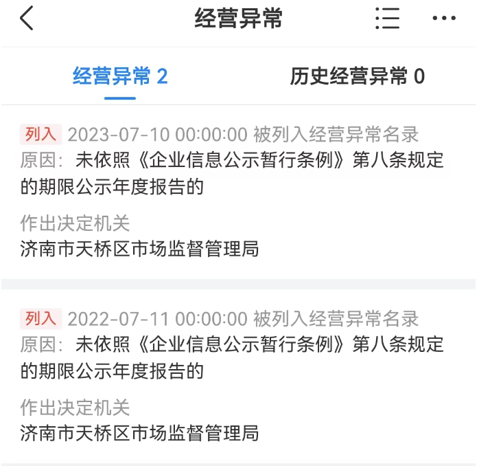 天眼查App显示,近日,蓝翔技校因未按规定期限公示年度报告,被济南市天桥区市场监督管理局连续两年列入经营异常名录。