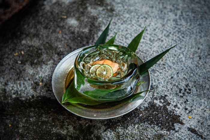 【口直·素面 海胆 天然莼菜】口直中的素面因加入了一味小麦壳而添一缕芬芳,配着甘甜的海胆,置于主厨亲手凿出的冰碗中,更添夏日中的一抹凉爽。