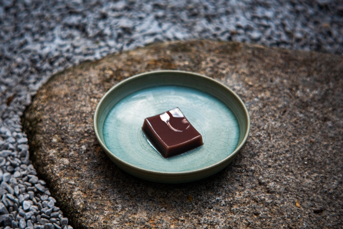 【菓子·水羊羹 抹茶 】作为甜品的水羊羹,需要三天的制作工序,一天泡赤小豆、一天熬煮,最后用大中小不同密度的筛网过滤红豆七次,直至品相细腻如沙。