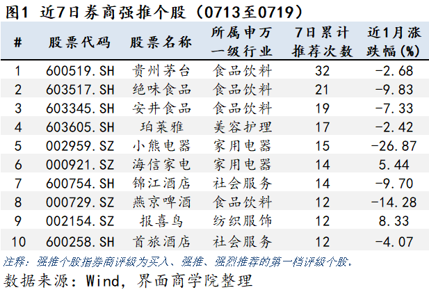 上图将券商近7日(7月13日至7月19日)推荐的个股按被推荐次数由高到低排序。共有10只个股得到券商一周之内推荐12次以上,17只个股被推荐10次以上。