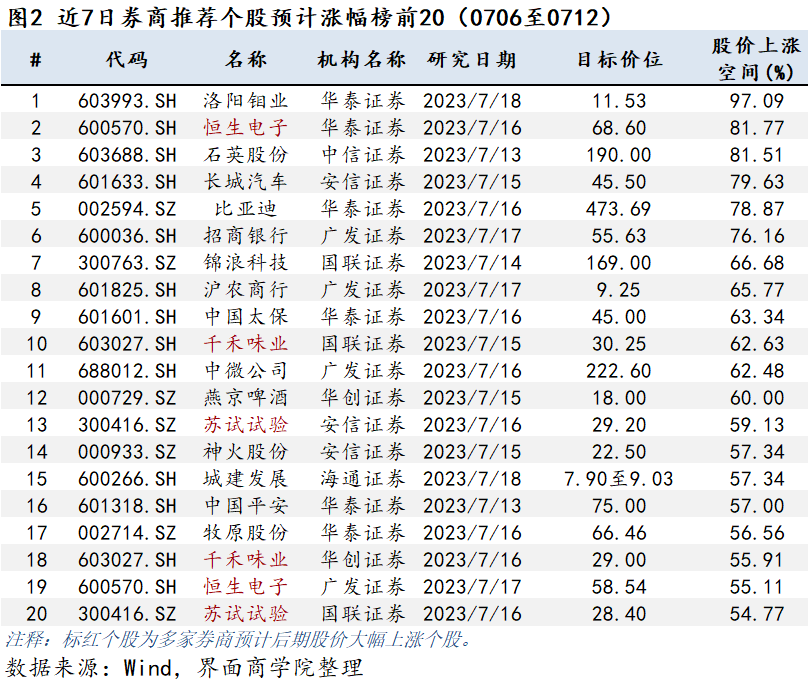 上图将券商近7日(7月13日至7月19日)推推荐的个股按预期股价上涨空间由高到低排序,股价上涨空间计算基数均以最新交易日收盘价为准,其中券商目标价通常指未来3至6个月券商预测目标价。其中,华泰证券预测洛阳钼业股价后续上涨空间为97.09%。恒生电子、千禾味业、苏试试验三家上市公司被多家券商预计将实现大幅上涨。