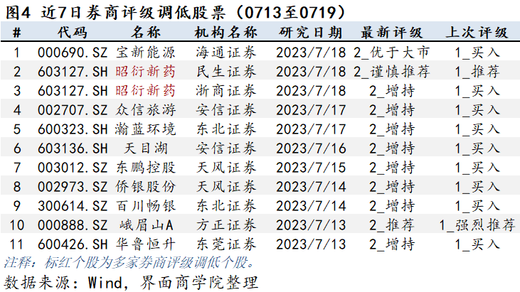 上图为券商个股在过去一周的评级下调情况。近7日共有11篇研报对10家A股公司评级进行下调。其中昭衍新药得到两家券商下调评级。