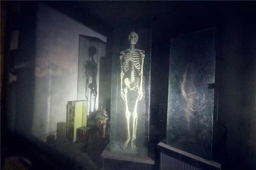 有一次,我们夜探某医院的地下人防,里面不仅亮着一盏灯,还有一个房间摆满了人体标本。门口就站着一副人体骨架,旁边是一个 7-8 岁小男孩的人体标本,看得你后背发凉。