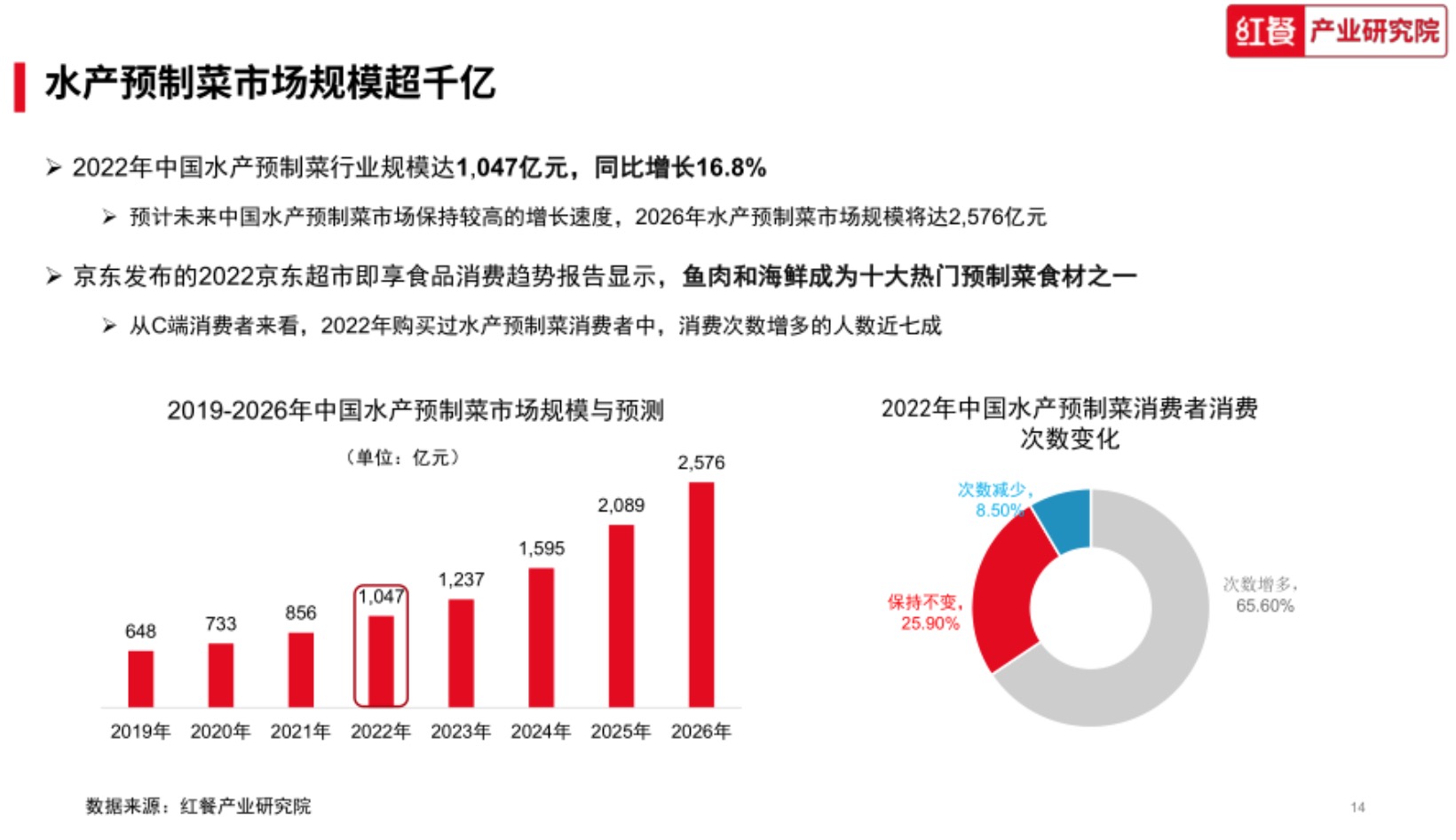 此前红餐产业研究院发布的《中国水产预制菜研究报告2023》表示,水产靠预制菜实现全年长红。报告显示,2022年中国水产预制菜行业规模达1047亿元,同比增长16.8%,预计未来中国水产预制菜市场将保持较高的增长速度,2026年水产预制菜市场规模将达2576亿元。
