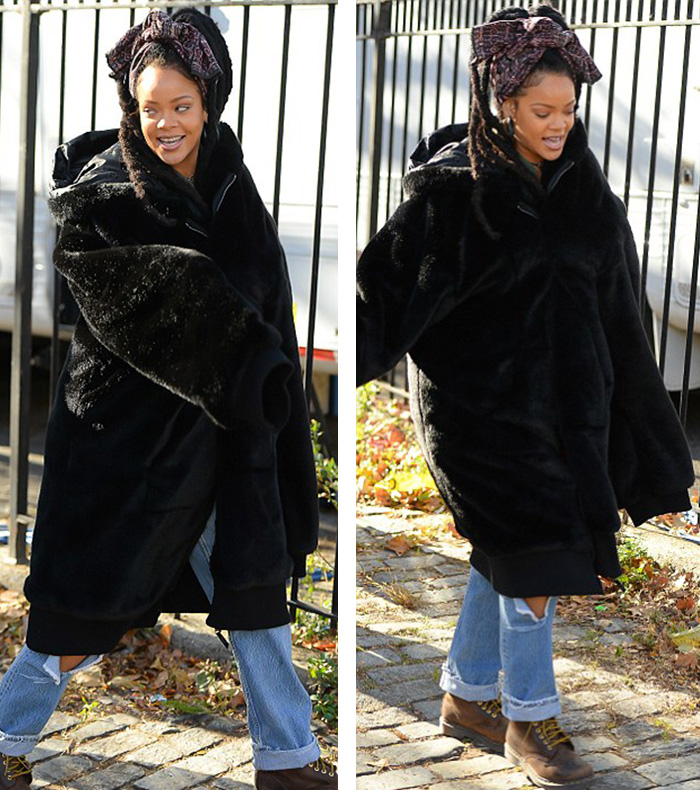 当天同样在片场的还有“日日”蕾哈娜(Rihanna),照片中她正走向拍摄现场,穿着件超大号毛绒外套,脚上踩着双Timberland马丁靴,她将一头黑色编成了脏辫,头上还系着条头巾。