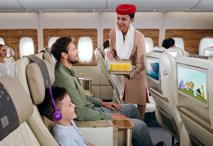 每年7月,正值暑假旅游高峰期。阿联酋航空为儿童定制了20款贴心服务,给家庭出行提供了极大的便利。例如,为家庭乘客提供优先登机服务,针对独自旅行的5-11岁儿童,提供免费的“无成人陪伴儿童乘客服务”。对于带有婴儿的父母,飞机上还配有奶粉、奶瓶和婴儿用品包,家长也可以预订带有摇篮的座位。