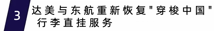 2023年7月17日,美国达美航空和中国东方航空重新恢复了“穿梭中国” 行李直挂服务。现在,搭乘达美航班从美国前往中国、并经上海浦东国际机场转乘东航航班的旅客,可以将行李直接托运至目的地城市。同样,旅客从中国内地城市经由上海浦东转乘达美航班前往美国,也可以在其出发城市将行李交给东航,直接托运至美国。