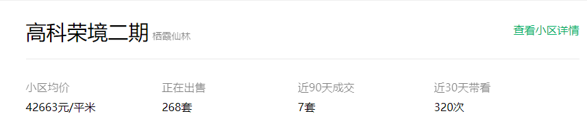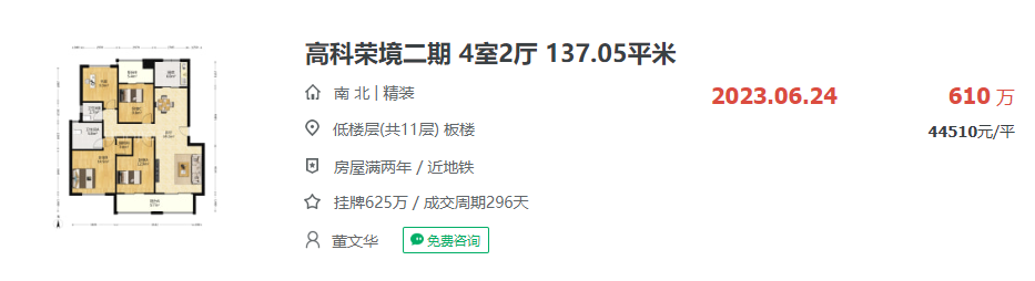 同在仙林湖的高科荣境二期小高层产品,挂牌均价近4.3元/㎡,今年6月成交一套137.05㎡四室两厅,成交单价44510元/㎡。