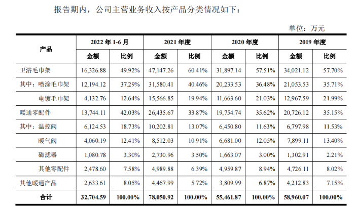 其中,公司主营业务收入占营业收入总额的比例分别为99.65%、99.66%、97.56%和96.25%,主营业务收入主要包括卫浴毛巾架、暖通零配件和其他暖通产品;其他业务收入占比较低,主要系钢材及废料销售收入。