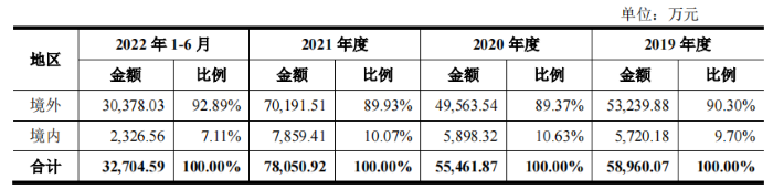 2019年至2022年6月末,公司境外销售收入金额分别为5.32亿元、4.96亿元、7.01亿元和3.04亿元,占主营业务比例分别为90.30%、89.37%、89.93%和92.89%;公司汇兑损益分别为-379.76万元、1169.04万元、470.14万元和-233.11万元,占同期利润总额的比例-9.27%、92.04%、6.02%和-9.47%。
