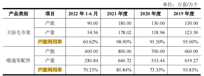 值得注意的是,欧洲地区由于受外部经济环境、俄乌冲突以及新冠疫情防控措施的逐步取消,居家办公、装修高峰过后,市场需求出现了一定的回落。2022年上半年,公司主营产品卫浴毛巾架收入1.63亿元,较上年同期下降20%左右,产能利用率也从2021年的98.90%下降至60.62%,同时,暖通零配件的产能利用率也同比下降10个百分点。