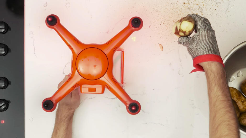 不过这家公司却独辟蹊径,不宣传自己无人机的航拍和飞行技能,而是不务正业地用无人机做起了菜。不但用飞速旋转的机翼给胡萝卜和土豆削皮,还用无人机吊着一只鸡放在油锅里炸,让人目瞪口呆。