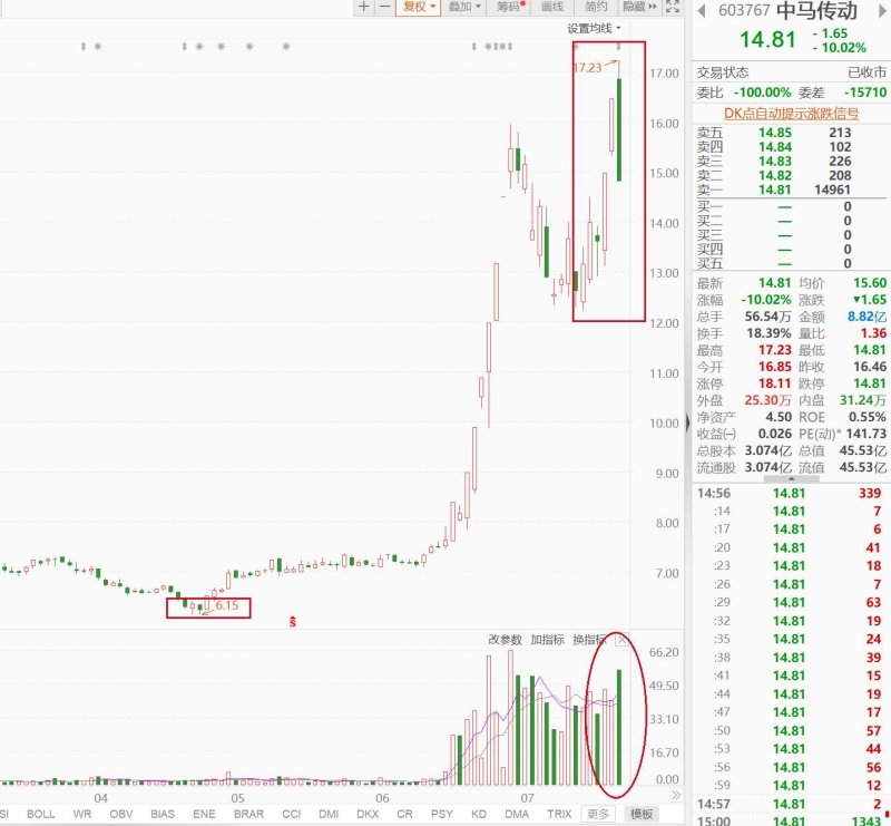 7月21日,中马传动(603767.SH)股价开盘冲高,之后迅速下挫,最终于下午封死跌停板,截至收盘,每股价格为14.81元,跌10.02%,全天成交56.54万手、8.82亿元,换手率为18.39%,相比于前两个交易日,成交量出现明显放大。此前,中马传动收获连续两个涨停板。