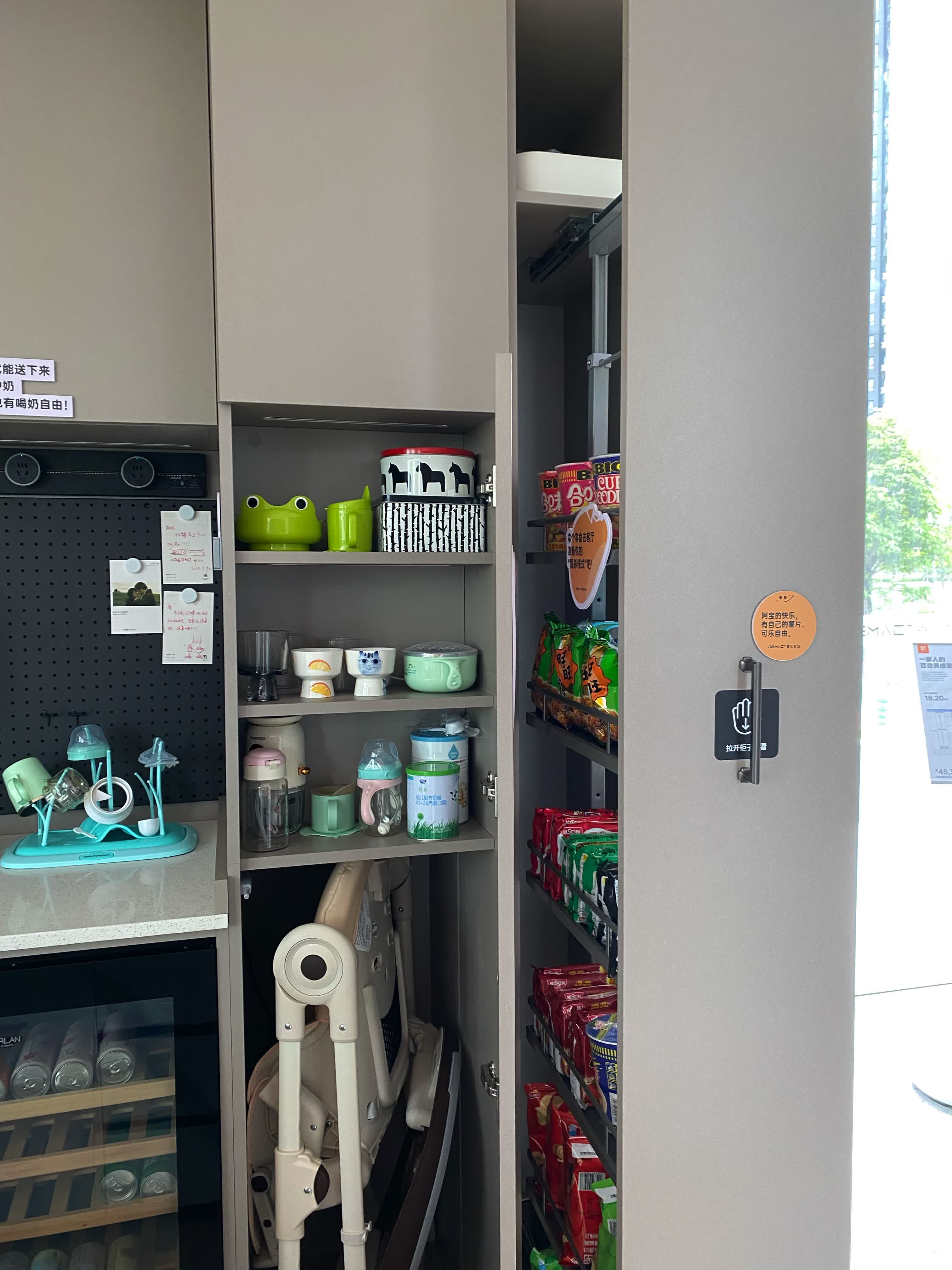 而在该门店的设计中,水吧还和婴童区有所结合。在水吧的最右侧的柜子中放置了不少儿童用品,其中就包括了可折叠的儿童椅。在柜体设计上,最右侧还有镂空的零食架。