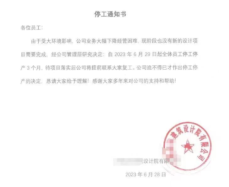但即使这样,仍有些建筑设计院缺项目,生存困难。今年6月28日,上海一家建筑设计院发了一份停工通知书,宣布停工停产3个月。