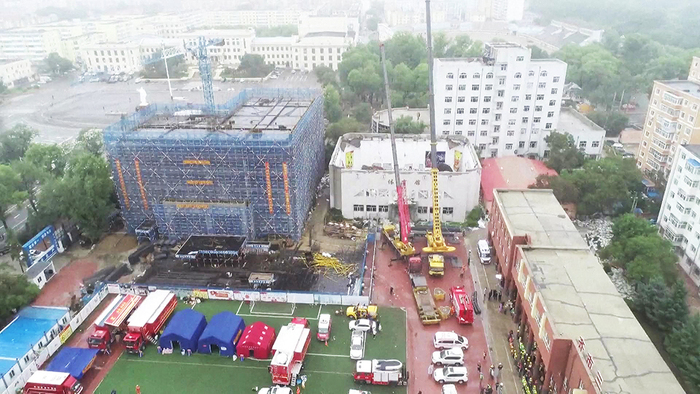 7月23日,黑龙江省齐齐哈尔市第三十四中学体育馆发生屋顶坍塌,事故现场的救援工作正在进行当中。
