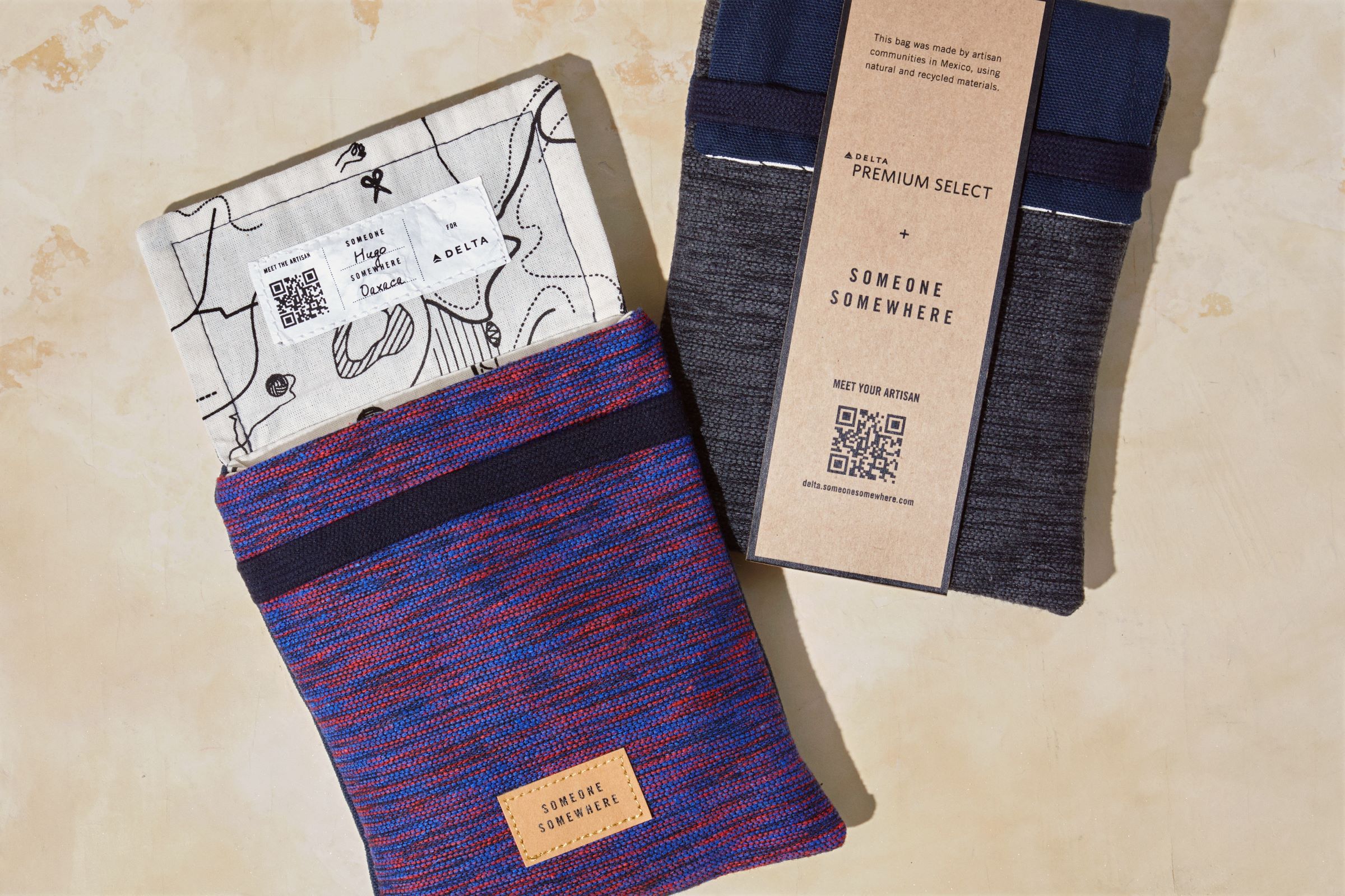 Someone Somewhere的每一个产品都由墨西哥的纺织工匠们设计和制造,达美航空的机上洗漱包同样如此。这一系列洗漱包共有三种设计,每个包袋都拥有专属二维码,扫码就能了解到制作这个包包的手工艺人相关介绍。