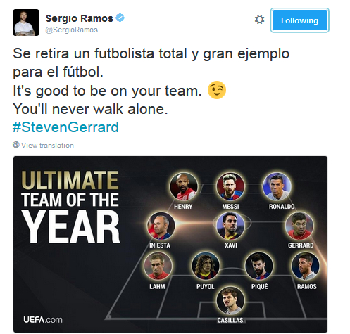 北京时间11月24日,前利物浦队长、英格兰球星杰拉德宣布退役,结束了长达19年的职业球员生涯。消息一出,托雷斯、阿隆索等杰拉德的前队友以及曾经与他对阵过的球星纷纷在社交网络上表达对杰拉德的祝福。托雷斯写到:“很荣幸和你一起踢过球。”而与杰拉德共同举起过欧冠奖杯的阿隆索则称他为“永远的传奇”。此外,曾经的红军旧将西塞、阿格、欧文和卡拉格等人也均他送去祝福。与杰拉德从未共事过的皇马队长拉莫斯则称:“很荣幸曾和你在一支队伍里(欧足联年度最佳阵容),你永远不会独行!”