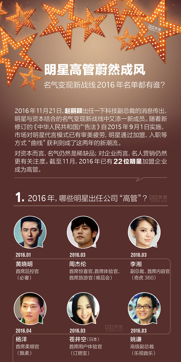 11月21日,赵丽颖出任一下科技副总裁的消息传出,明星与资本结合的名气变现新战线中又添一新成员。截至11月,2016年已有22位明星加盟企业成为高管。