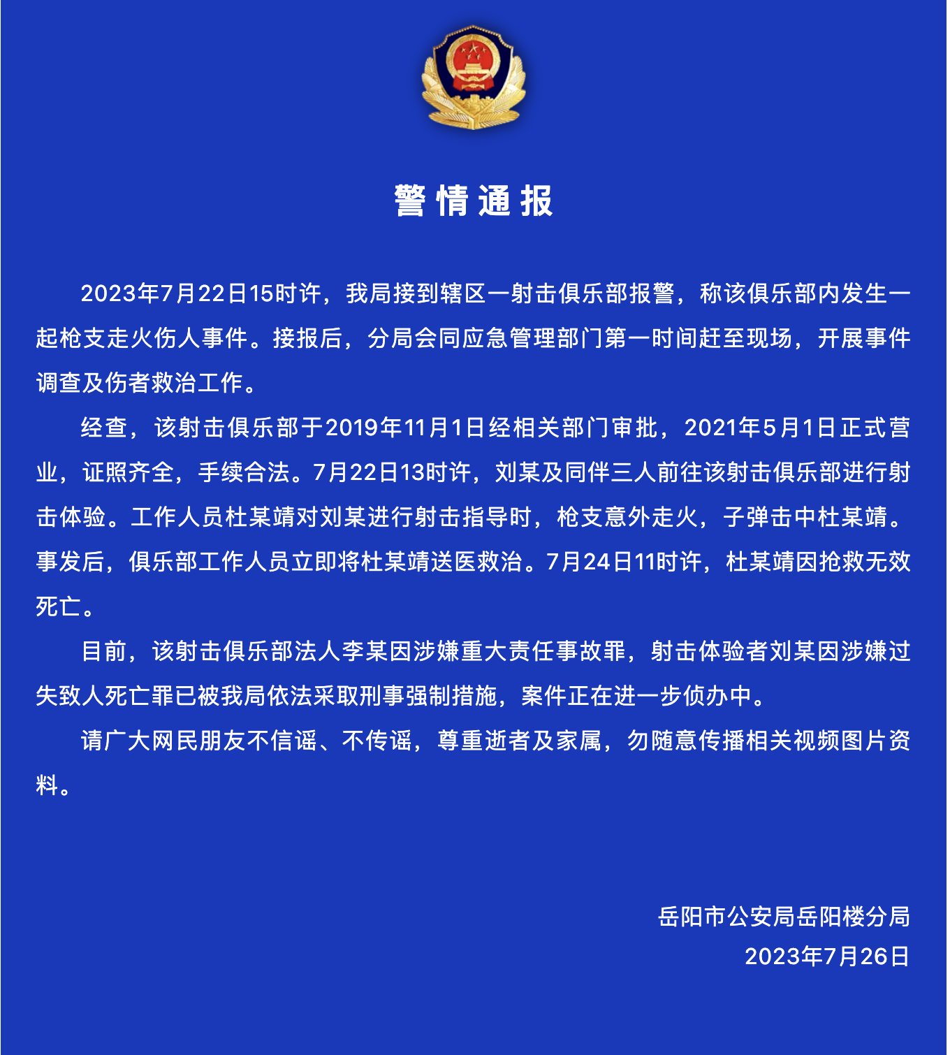 目前,该射击俱乐部法人李某因涉嫌重大责任事故罪,射击体验者刘某因涉嫌过失致人死亡罪已被警方依法采取刑事强制措施,案件正在进一步侦办中。