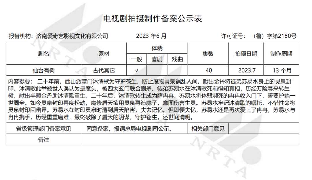 古装仙侠题材《仙台有树》由济南爱奇艺影视文化有限公司备案。该剧由爱奇艺出品,诸神联盟影业联合出品,改编自网文作者狂上加狂连载于晋江文学城的同名小说。