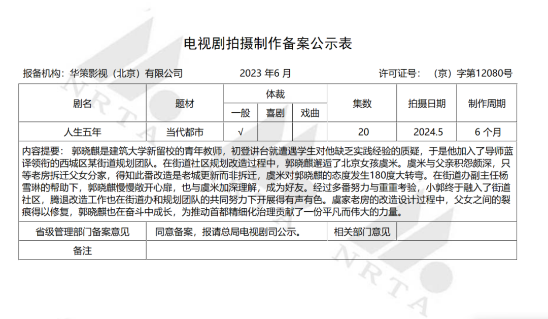 《人生五年》由华策影视(北京)有限公司备案,并由华策影视出品、制作,曾入选北京市“十四五”电视剧重点规划项目。