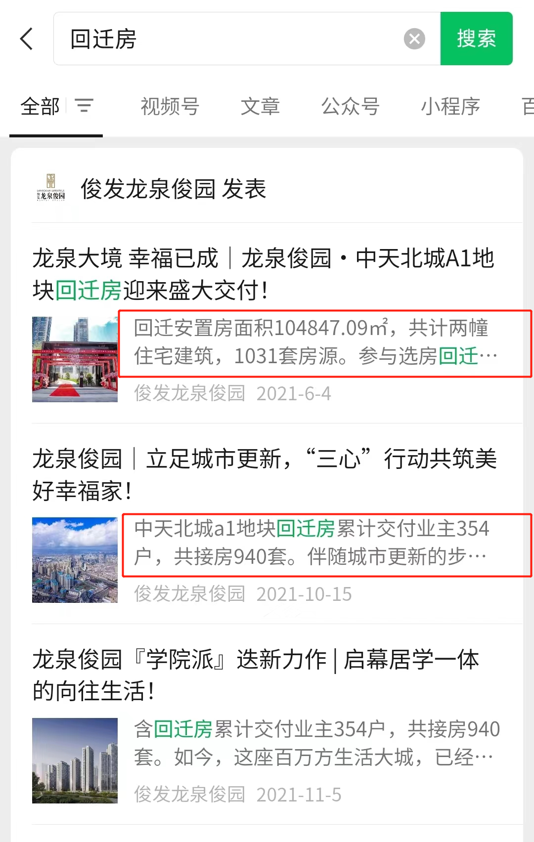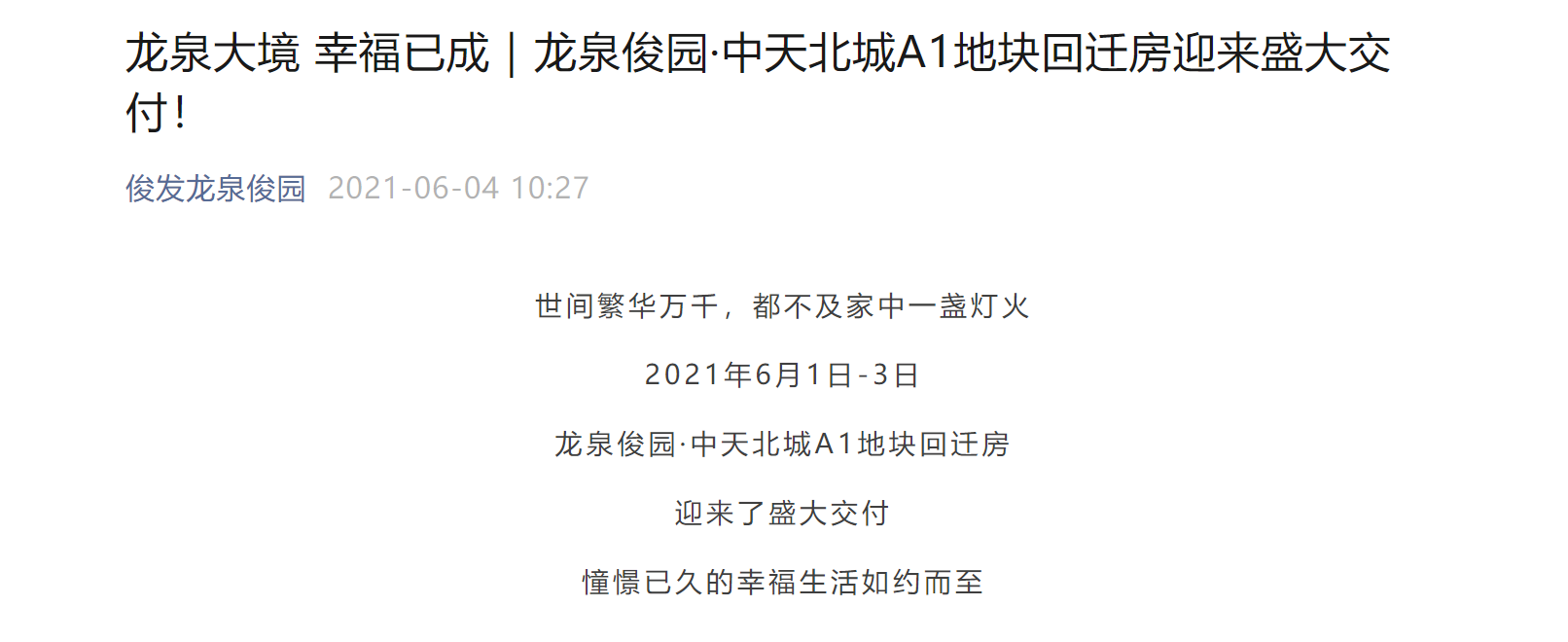 据了解,早在2021年6月4日,“俊发龙泉俊园”公众号发布消息,宣称中天北城(A1地块)作为回迁房于6月1日-3日进行了盛大交付。