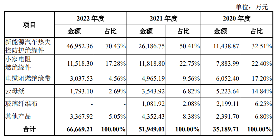 2022年,浙江荣泰主营收入按产品类型可分为五大板块,分别为新能源汽车热失控防护绝缘件、小家电阻燃绝缘件、电缆阻燃绝缘带、云母纸、其他产品。报告期间,随着新能源相关业务规模的扩大,来自新能源汽车热失控防护绝缘件的销售收入逐年增长,其收入占比也由2020年的 32.51%增至2022年的70.43%。新能源汽车热失控防护绝缘件已经成为了公司主要的营收来源。