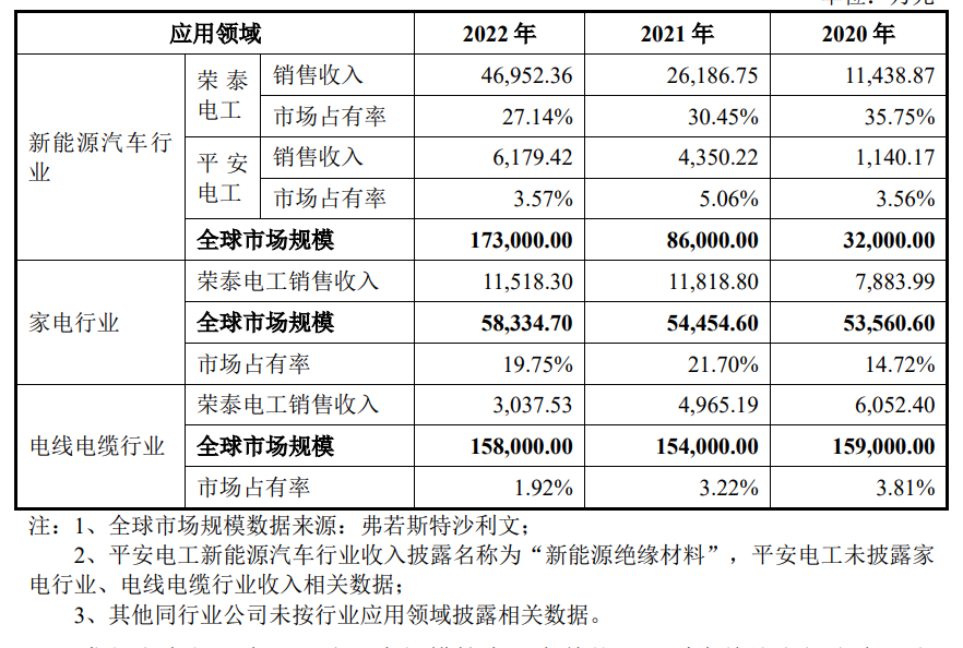 此外,浙江荣泰新能源行业相应的全球市占率为27.14%,已经属于第一梯队。作为对比,平安电工的市场占有率约为3.57%。