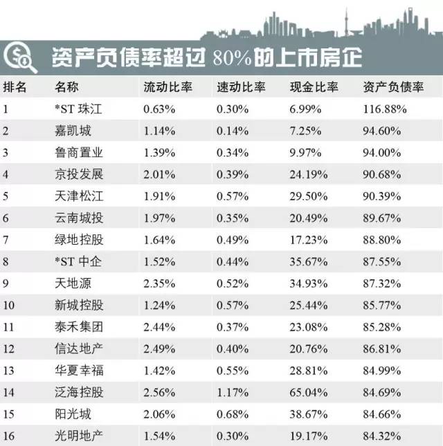 资产负债率最高的房企是*ST珠江,高达116.88%,比去年同期增加了8.6个百分点,剔除预收款项后的资产负债率为131.18%,同比增加了21.15个百分点。嘉凯城资产负债率为94.6%,同比增加9个百分点。鲁商置业资产负债率为94%,同比增长近2个百分点。京投发展资产负债率为90.68%;天津松江资产负债率为90.39%。