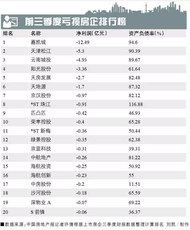 亏损上市房企有20家。前五名亏损最严重的房企分别是嘉凯城(亏损12.49亿元)、天津松江(亏损5.3亿元)、云南城投(亏损4.93亿元)、阳光股份(亏损3.36亿元)、天房发展(亏损2.7亿元)。
