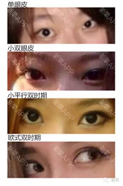 原来的小单眼皮变成了窄双眼皮,眼睛大了不少,不知道是做的还是双眼皮贴时期。接下来就变成了小平行外双,眼妆很浓双眼皮也清晰可见。