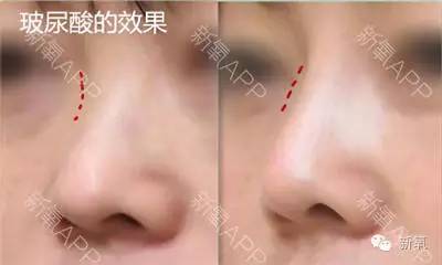 另外要注意的是玻尿酸反复打,量过大的话即使是交联的玻尿酸也是容易向外扩散的,山根也会容易变宽。当打的玻尿酸量很大,皮肤被撑得很薄,就产生了玻尿酸隆鼻的透光现象啦。