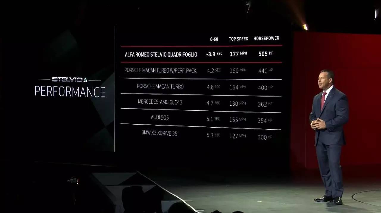 然后他对着阿尔法·罗密欧的全新车型一阵狂赞后,公布了Stelvio Quadrifoglio的性能参数:2.9升V6双涡轮增压发动机,最大功率505马力,0-100公里/小时加速时间3.9秒,极速285公里/小时。