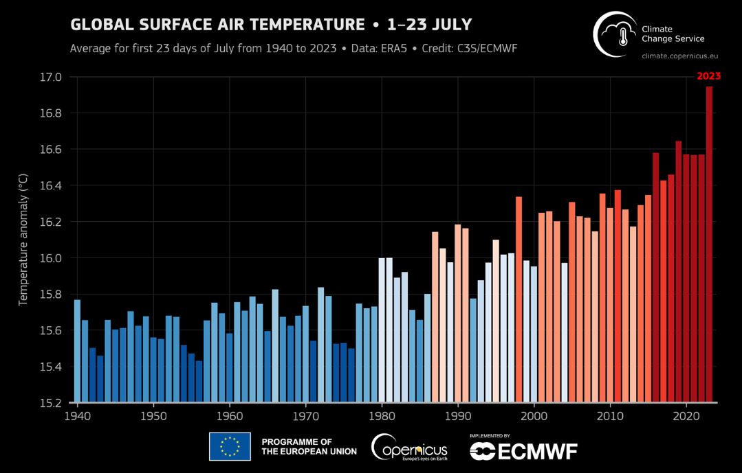 7月1日到23日,全球平均地表气温为16.95℃,超过2019年7月整月的16.63℃。今年以前,2019年7月是有记录以来的最热7月,同时也是最热月份。
