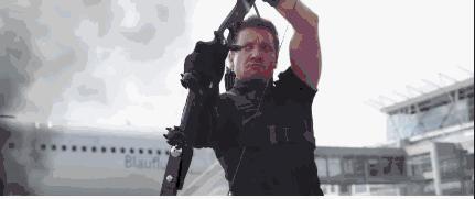 鹰眼在漫威电影宇宙里有着不凡的表现,在《复仇者联盟1》、《复仇者联盟2》和《美队3》中犹如一颗低调而闪耀的星星,唯一吐槽的是在《复联2》里竟然娶妻生子,打算退隐。当然,最帅的的还是鹰眼和蚁人合体技能!如下图所示: