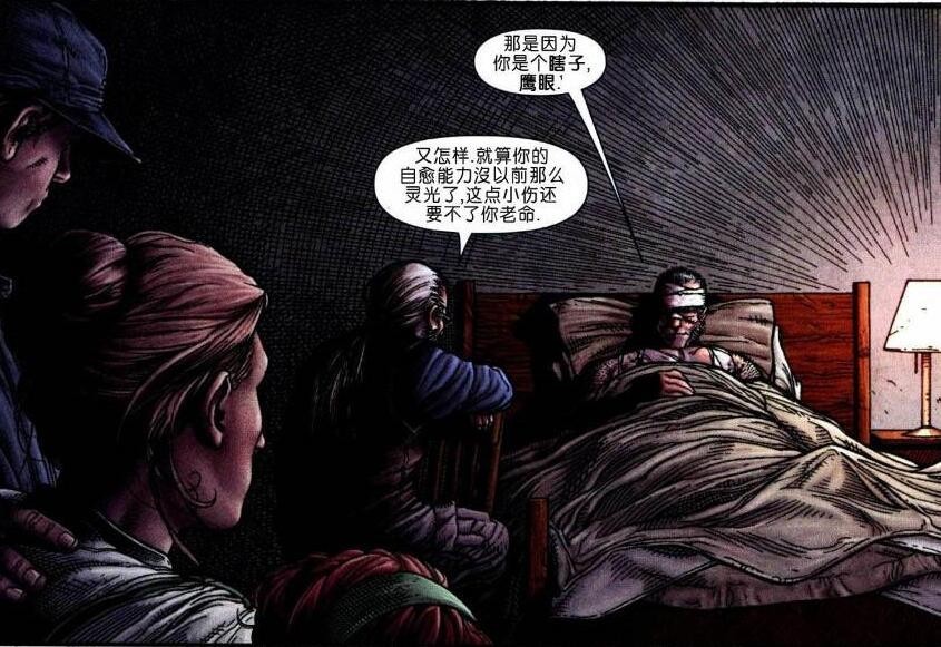 这时,我们通过背影,看到鹰眼已经是满头白发,尽显沧桑。而躺在病床上的金刚狼说道“你是个瞎子”。