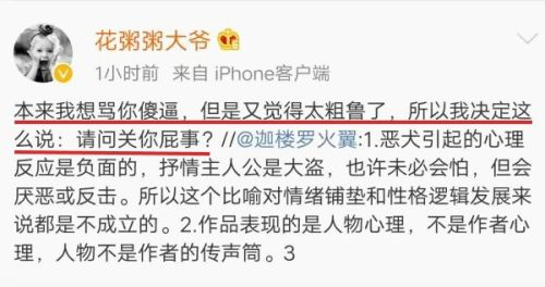 扬州大学文学院的一位副教授在听完之后,在微博上痛苦的发了一句牢骚“这是什么狗屁不通的东西。在出租车上听见的,真是刷新难听底线”。结果,被称为“民谣女流氓”的花粥转发了该老师的微博,并粗俗的回应:“关你屁事?”