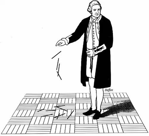 在地板上画一系列间距为2厘米的平行线,然后把一根长度为1厘米的针扔在地板上。那么,这根针与地板上的线条相交的概率是多少呢?1733年,法国博物学家布丰第一次提出了这个问题。1777年,布丰自己解决了这个问题——这个概率值是1/π。