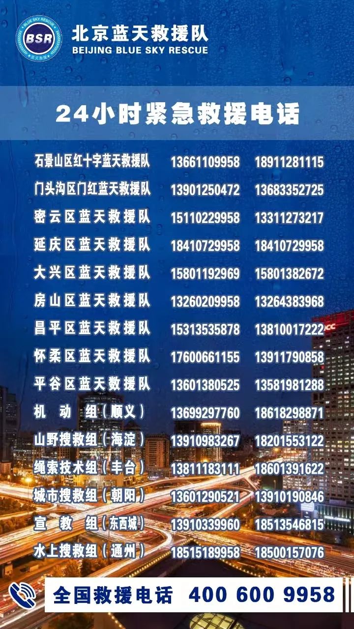 因为灾情相对严重,北京蓝天救援队( 400 600 9958)官方电话一直处于忙碌中,所以显示无法接通,请大家不要集中拨打或者长时间咨询。有紧急求助请大家直接拨打各区电话。