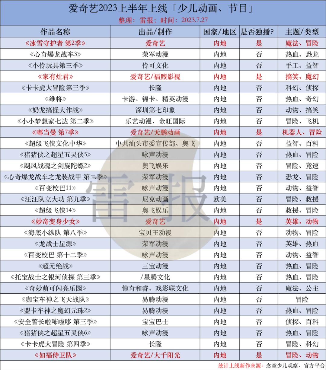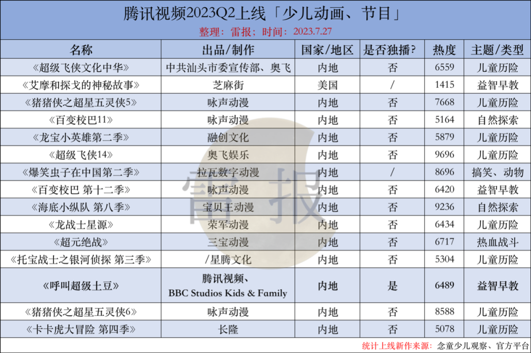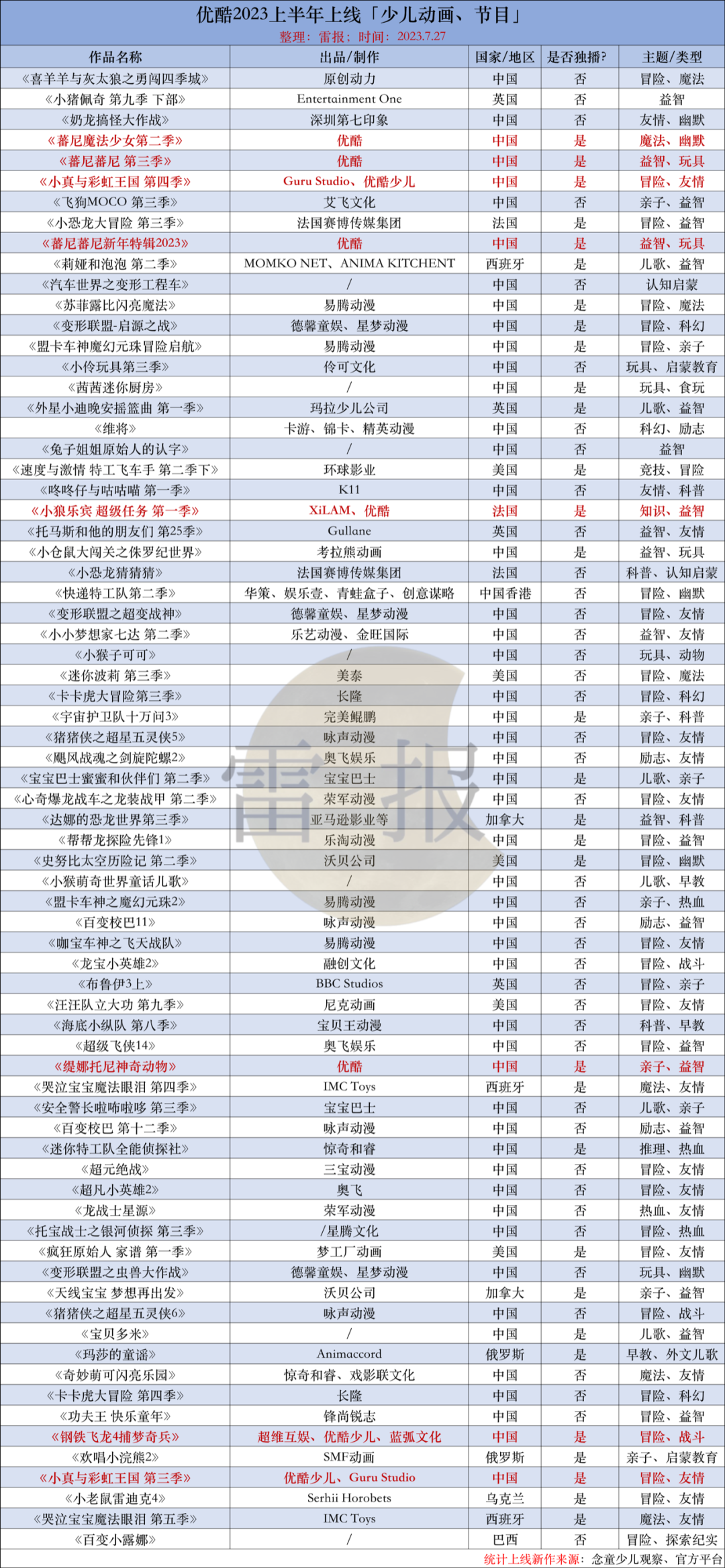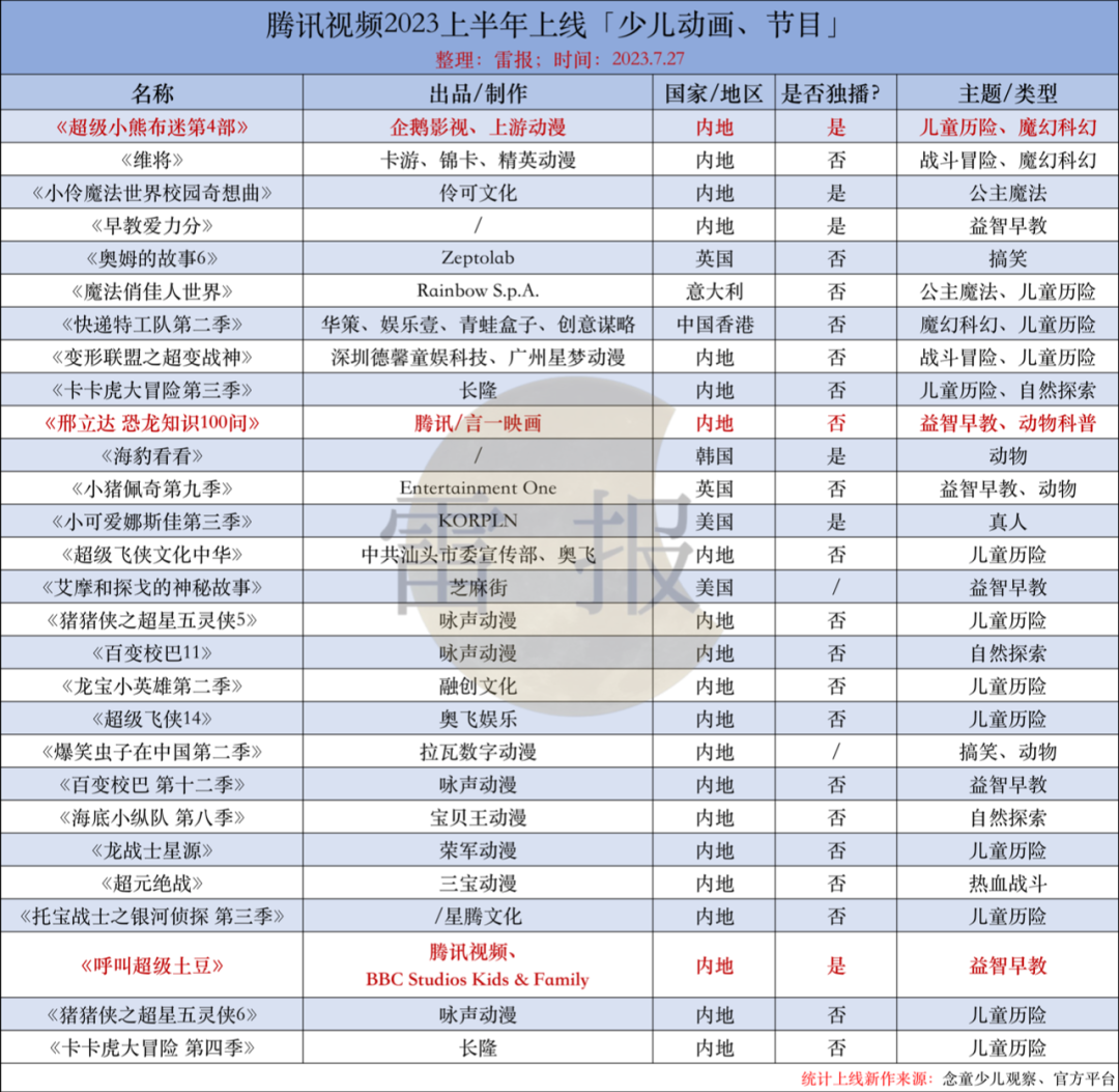 半年已过,来看少儿内容板块(包含动画以及部分少儿真人节目),几大视频平台上线节目情况如何。